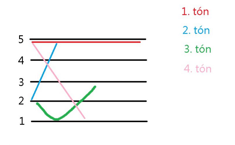 Čínština používá 4 tóny: 1. vysoký rovný – hlas je stále ve stejné vysoké hladině 2. stoupající – hlas strmě stoupá (otázka) 3. klesavo-stoupající – hlas jde jemně dolů do hloubky a poté se zvedá nahoru 4. klesavý – hlas strmě klesá z vysoké úrovně do hluboké (rozkaz) Dále se používá slabika bez tónu – vyslovuje se klasicky bez jakéhokoli použití tónu Příklad užití tónů při slabice MA: 1. tón 妈 – matka(mā) 2. tón 麻 - konopí(má) 3. tón 马 - kůň(mǎ) 4. tón 骂 – nadávat(mà) slabika bez tónu 吗 (ma) – tázací partikule - čteme jako neutrální ma např. ve slově zmatek, matka, Matěj. Bez hlasové intonace Můžeme tedy vyvořit větu: 妈骂马吗? (mā mà mǎ ma?) Nadává matka koni? ☺